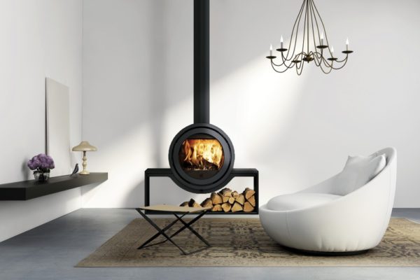 – Poêle rond en acier couleur anthracite – Combustion à haute température sur sole pleine avec isolation en vermiculite moulée